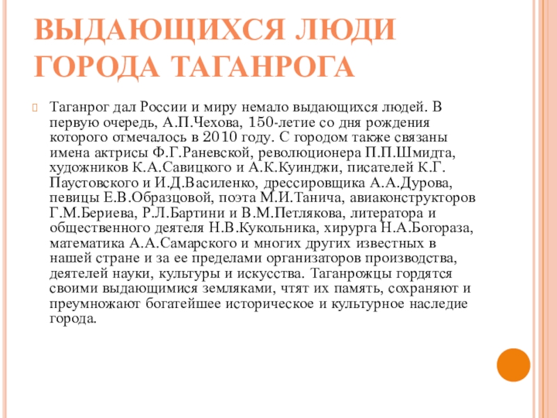 Слайд 21ВЫДАЮЩИХСЯ ЛЮДИ ГОРОДА ТАГАНРОГА