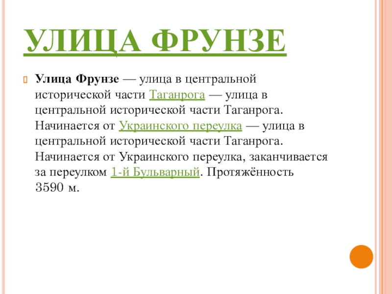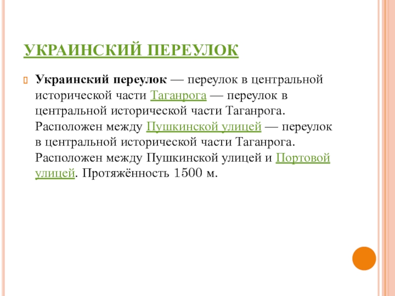 центральной исторической части Таганрога. Начинается от Украинского переулка — улица в центральной исторической части Таганрога. Начинается от Украинского переулка, заканчивается за переулком 1-й Бульварный. Протяжённость 3590 м.