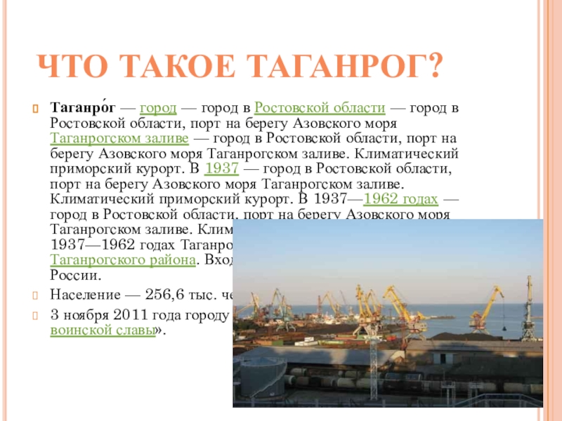 области, порт на берегу Азовского моря Таганрогском заливе — город в Ростовской области, порт на берегу Азовского моря Таганрогском заливе. Климатический приморский курорт. В 1937 — город в Ростовской области, порт на берегу Азовского моря Таганрогском заливе. Климатический приморский курорт. В 1937—1962 годах — город в Ростовской области, порт на берегу Азовского моря Таганрогском заливе. Климатический приморский курорт. В 1937—1962 годах Таганрог был административным центром Таганрогского района. Входит в список исторических городов России.