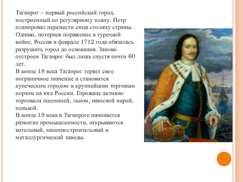Слайд 4Таганрог – первый российский город, построенный по регулярному плану. Петр планировал