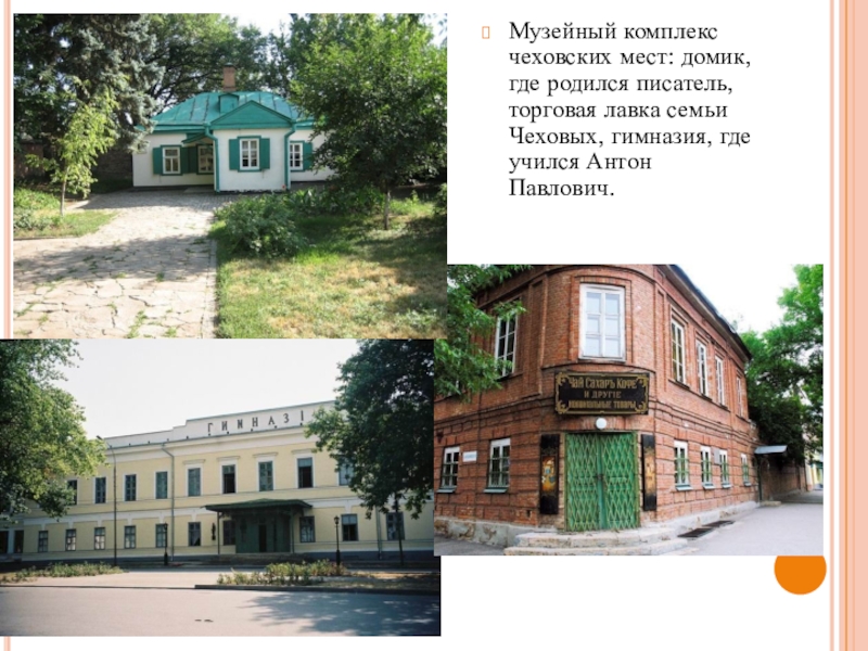 Слайд 8Музейный комплекс чеховских мест: домик, где родился писатель, торговая лавка семьи