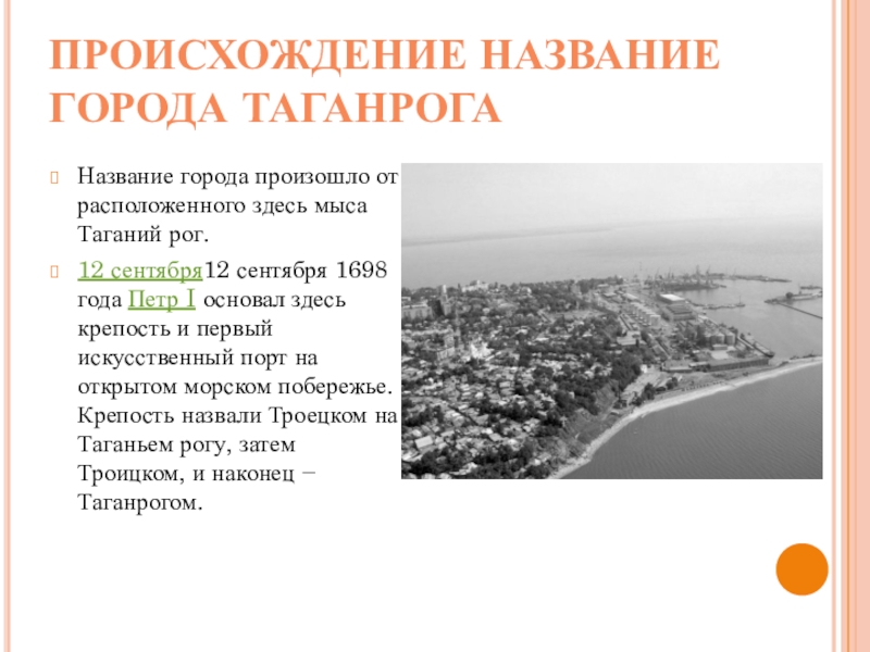 12 сентября12 сентября 1698 года Петр I основал здесь крепость и первый искусственный порт на открытом морском побережье. Крепость назвали Троецком на Таганьем рогу, затем Троицком, и наконец − Таганрогом.
