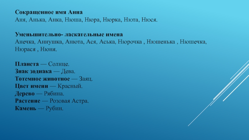 Анечка, Аннушка, Анюта, Ася, Аська, Нюрочка , Нюшенька , Нюшечка, Нюрася , Нюня.
