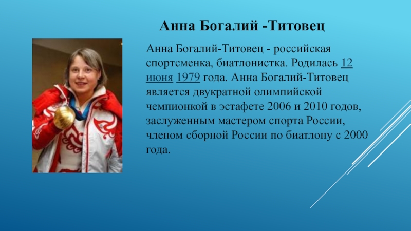 Слайд 11Анна Богалий-Титовец - российская спортсменка, биатлонистка. Родилась 12 июня 1979 года.