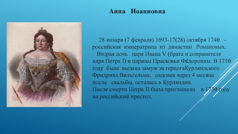 28 января (7 февраля) 1693-17(28) октября 1740 - российская императрица из династии Романовых.