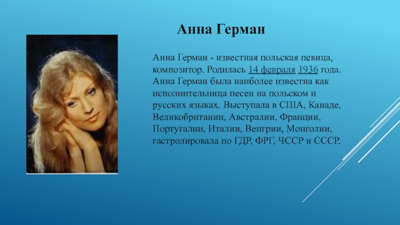 Слайд 10Анна Герман - известная польская певица, композитор. Родилась 14 февраля 1936