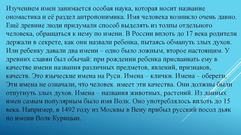 раздел антропонимика. Имя человека возникло очень давно. Ещё древние люди придумали способ выделять из толпы отдельного человека, обращаться к нему по имени. В России вплоть до 17 века родители держали в секрете, как они назвали ребенка, пытаясь обмануть злых духов. Или ребенку давали два имени – одно было ложным, второе настоящим. У древних славян был обычай: при рождении ребенка присваивать ему в качестве имени названия различных предметов, явлений, признаков, качеств. Это языческие имена на Руси. Имена – клички. Имена – обереги. Эти имена не означали, что человек имеет эти качества. Они должны были отпугнуть злых духов. Имена – названия животных, растений. Из данных имен самым популярным было имя Волк. Оно употреблялось вплоть до 15 века. Например, в 1492 году из Москвы в Вену прибыл русский посол дьяк по имени Волк Курицын.