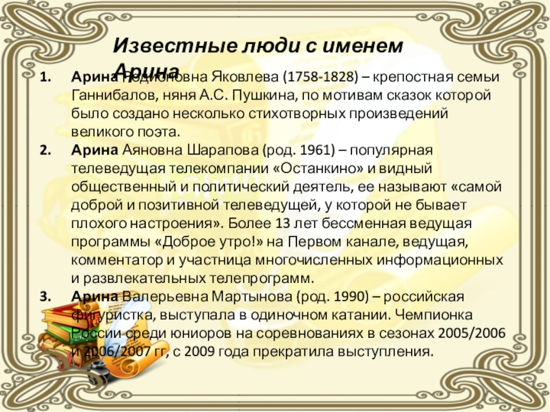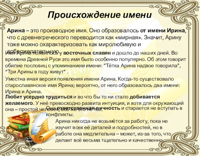 Имя Арина появилось у восточных славян и дошло до наших дней. Во времена Древней Руси это имя было особенно популярно. Об этом говорит обилие пословиц с упоминанием имени: “Тётка Арина надвое говорила”, “Три Арины в году живут” .