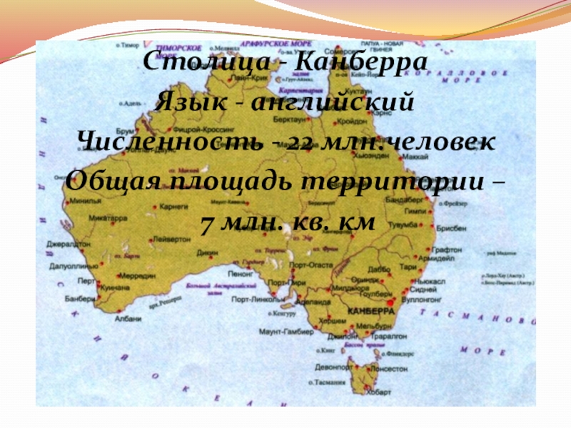 Столица - КанберраЯзык - английскийЧисленность - 22 млн.человекОбщая площадь территории – 7 млн. кв. км