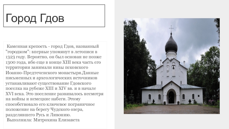 Каменная крепость - город Гдов, названный "городком": впервые упомянут в летописи в 1323 году. Вероятно, он был основан не позже 1300 года, ибо еще в конце XIII века часть его территории занимали нивы псковского Иоанно-Предтеченского монастыря.Данные письменных и археологических источников устанавливают существование Гдовского поселка на рубеже XIII и XIV вв. и в начале XVI века. Это поселение развивалось несмотря на войны и немецкие набеги. Этому способствовало его ключевое пограничное положение на берегу Чудского озера, разделявшего Русь и Ливонию.