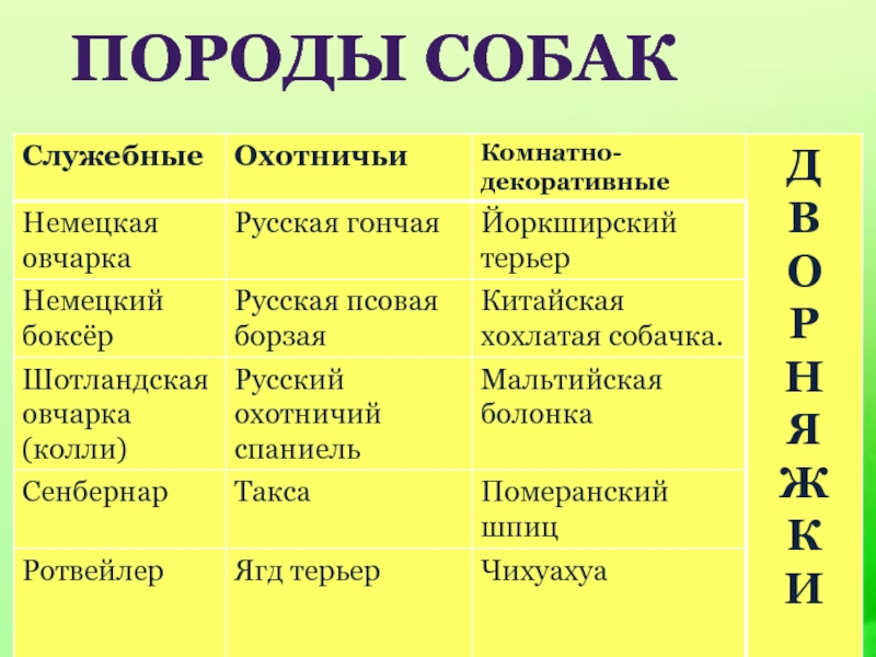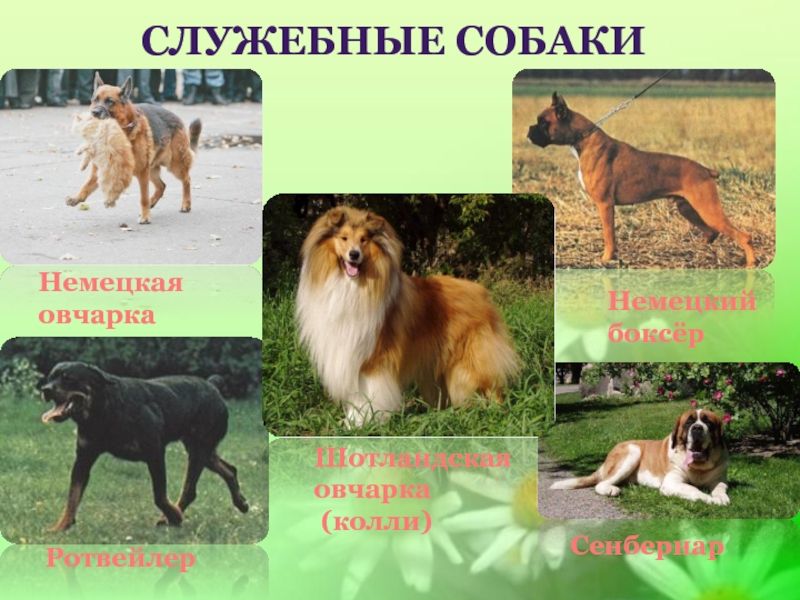 Служебные собакиНемецкая овчарка Немецкий боксёрШотландская овчарка (колли)СенбернарРотвейлер