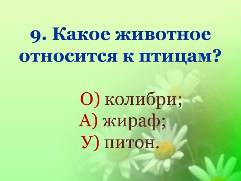 9. Какое животное относится к птицам?     О) колибри;  А) жираф; У) питон.