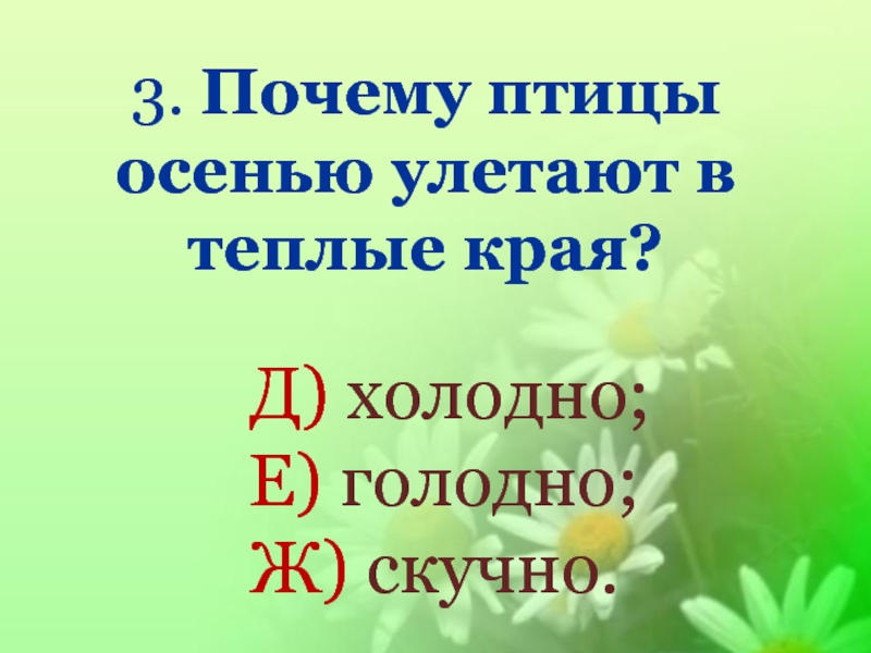3. Почему птицы осенью улетают в теплые края?    Д) холодно;  Е) голодно;