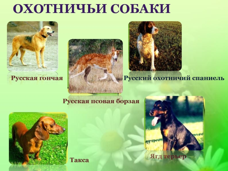 Охотничьи собакиРусская гончаяРусская псовая борзаяРусский охотничий спаниельТакса Ягд терьер