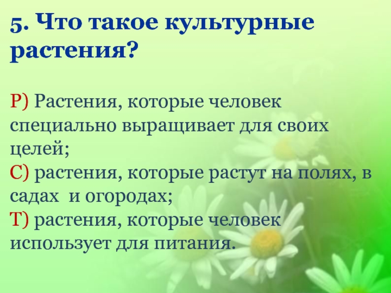 5. Что такое культурные растения?  Р) Растения, которые человек специально выращивает для своих целей; С) растения,