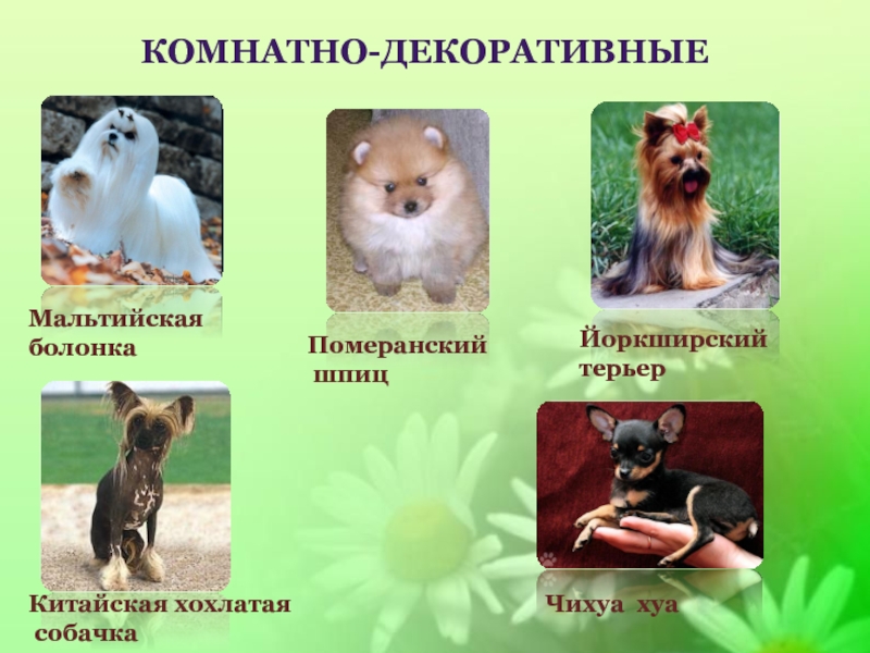 Комнатно-декоративныеЙоркширский терьерКитайская хохлатая собачкаМальтийская болонкаПомеранский шпицЧихуа хуа