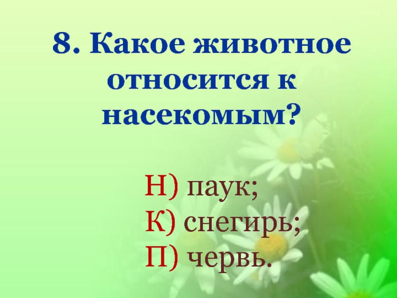 8. Какое животное относится к насекомым?  Н) паук;    К) снегирь;  П) червь.