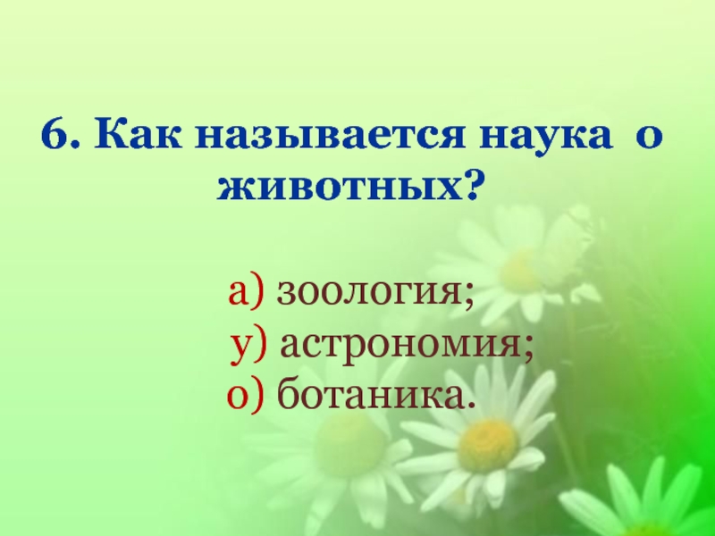 6. Как называется наука о животных?  а) зоология;    у) астрономия; о) ботаника.