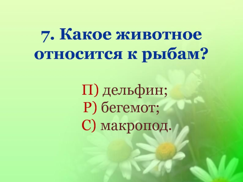 7. Какое животное относится к рыбам?   П) дельфин; Р) бегемот;   С) макропод.