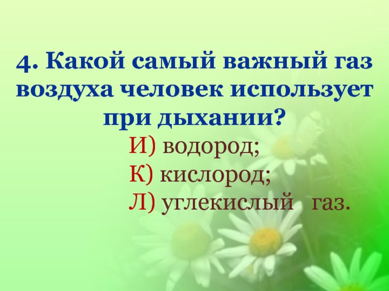4. Какой самый важный газ воздуха человек использует при дыхании?  И) водород;  К) кислород;
