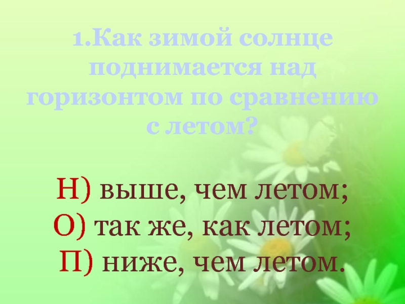 1.Как зимой солнце поднимается над горизонтом по сравнению с летом?  Н) выше, чем летом; О) так