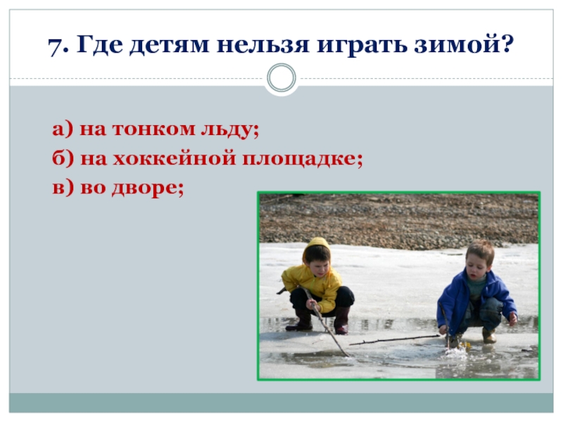 7. Где детям нельзя играть зимой?а) на тонком льду;б) на хоккейной площадке;в) во дворе;