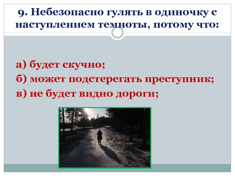 9. Небезопасно гулять в одиночку с наступлением темноты, потому что:а) будет скучно;б) может подстерегать преступник;в) не будет