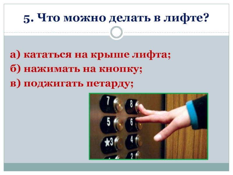 5. Что можно делать в лифте? а) кататься на крыше лифта;б) нажимать на кнопку;в) поджигать петарду;