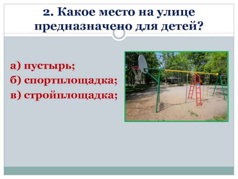 2. Какое место на улице предназначено для детей?а) пустырь;б) спортплощадка;в) стройплощадка;