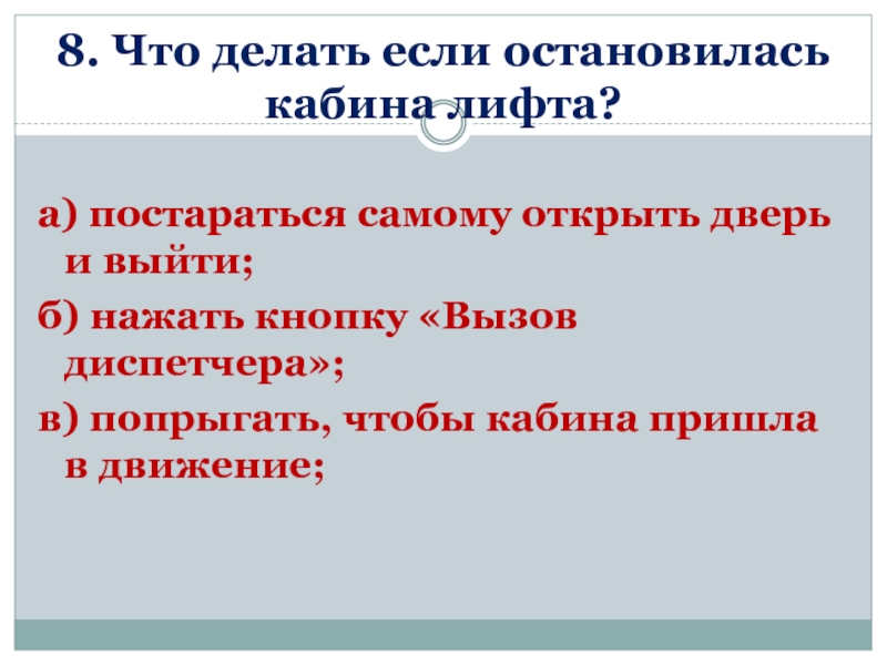 8. Что делать если остановилась кабина лифта?а) постараться самому открыть дверь и выйти;б) нажать кнопку «Вызов диспетчера»;в)