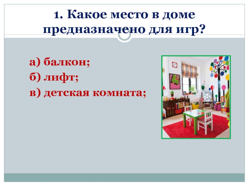1. Какое место в доме предназначено для игр?а) балкон;б) лифт;в) детская комната;