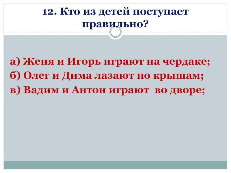 12. Кто из детей поступает правильно?а) Женя и Игорь играют на чердаке;б) Олег и Дима лазают по