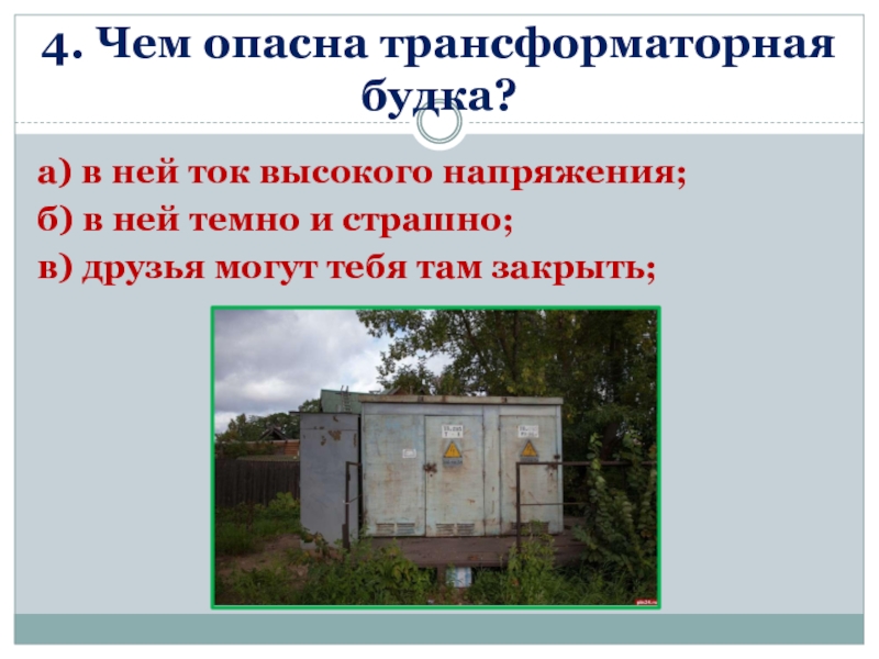 4. Чем опасна трансформаторная будка?а) в ней ток высокого напряжения;б) в ней темно и страшно;в) друзья могут