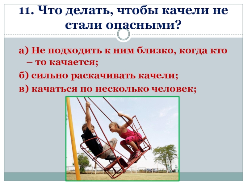 11. Что делать, чтобы качели не стали опасными? а) Не подходить к ним близко, когда кто –