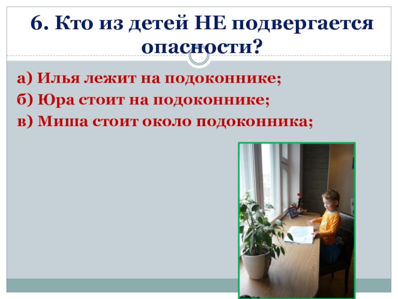 6. Кто из детей НЕ подвергается опасности?а) Илья лежит на подоконнике;б) Юра стоит на подоконнике;в) Миша стоит