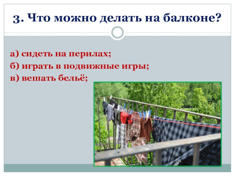 3. Что можно делать на балконе?а) сидеть на перилах;б) играть в подвижные игры;в) вешать бельё;