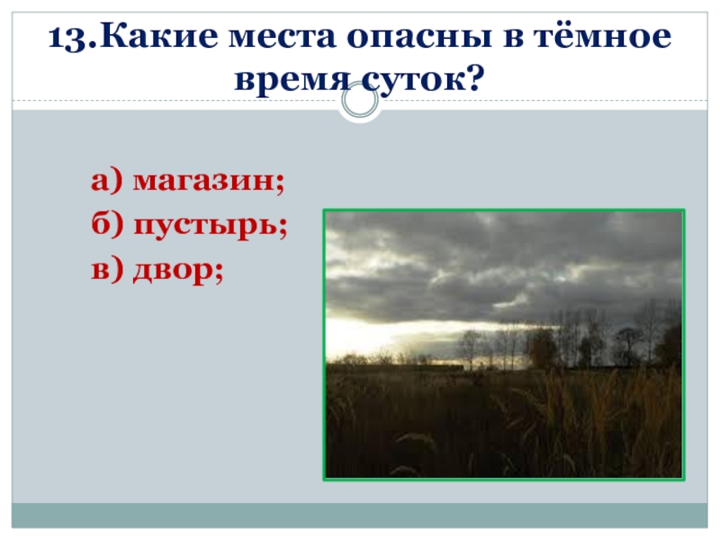 13.Какие места опасны в тёмное время суток?а) магазин;б) пустырь;в) двор;