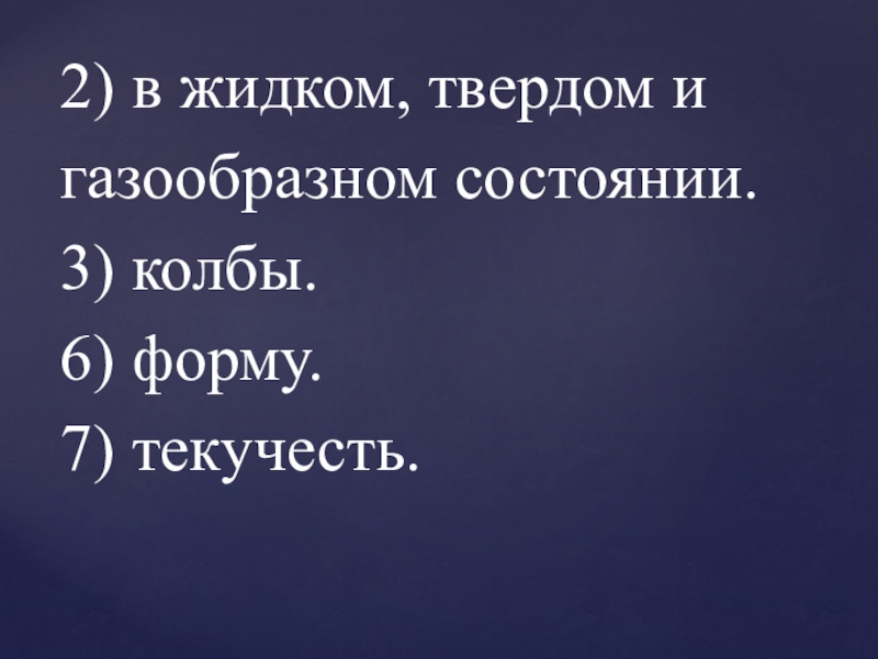2) в жидком, твердом и газообразном состоянии. 3) колбы. 6) форму. 7) текучесть.