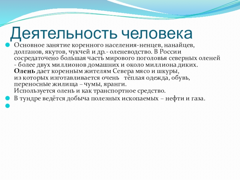 Деятельность человекаОсновное занятие коренного населения-ненцев, нанайцев, долганов, якутов, чукчей и др.- оленеводство. В России сосредаточено большая часть