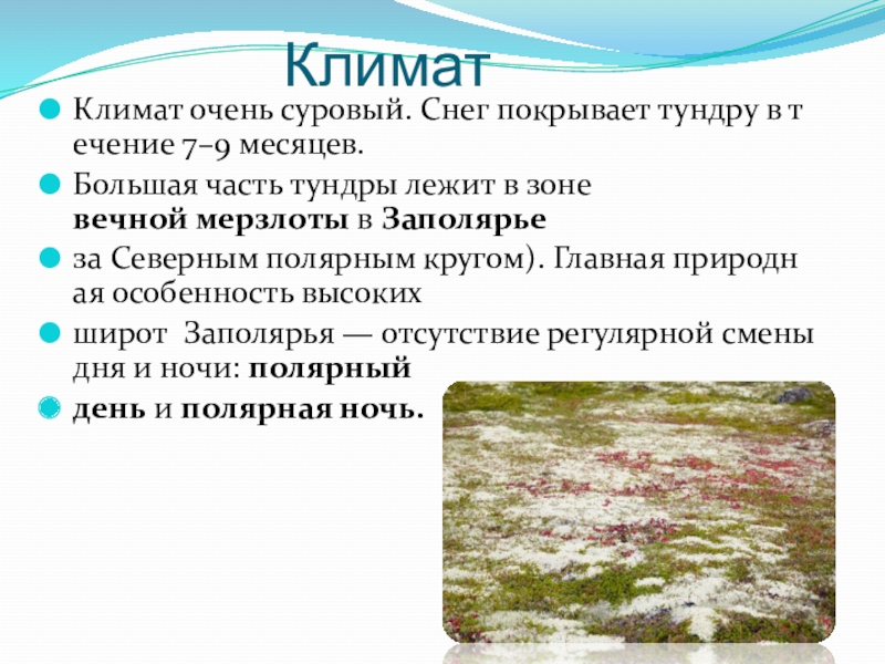 КлиматКлимат очень суровый. Снег покрывает тундру в течение 7–9 месяцев. Большая часть тундры лежит в зоне вечной мерзлоты в Заполярьеза Северным полярным кругом). Главная природная особенность высоких широт  Заполярья — отсутствие регулярной смены дня и ночи: полярный день и полярная ночь.
