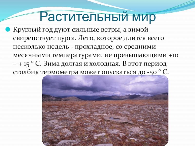 Растительный мирКруглый год дуют сильные ветры, а зимой свирепствует пурга. Лето, которое длится всего несколько недель -