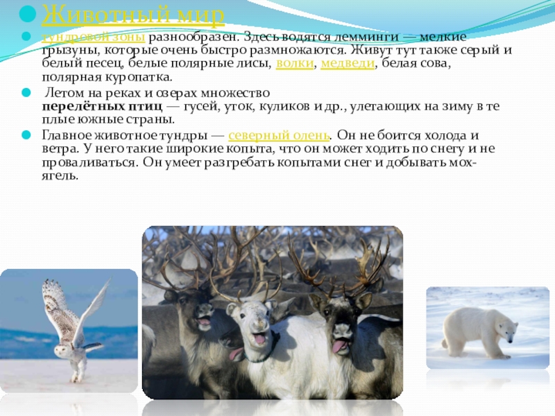 тундровой зоны разнообразен. Здесь водятся лемминги — мелкие грызуны, которые