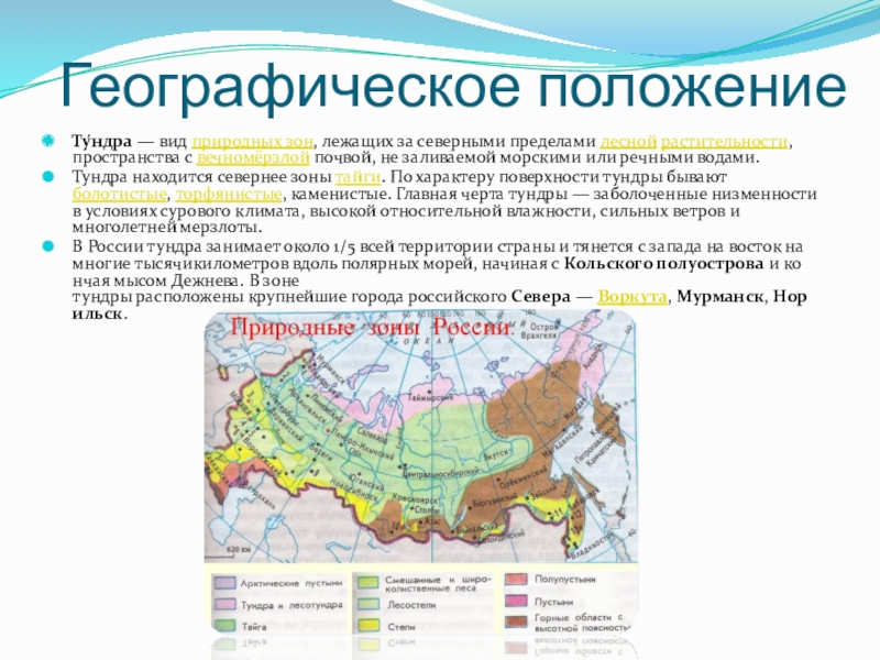 Географическое положениеТу́ндра — вид природных зон, лежащих за северными пределами лесной растительности, пространства с вечномёрзлой почвой, не заливаемой морскими или речными водами.Тундра