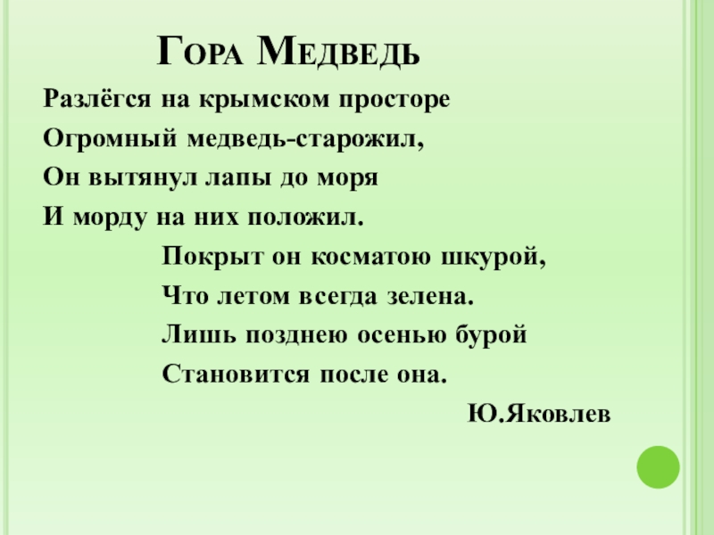 Гора МедведьРазлёгся на крымском простореОгромный медведь-старожил,Он вытянул лапы до моряИ морду на них положил.