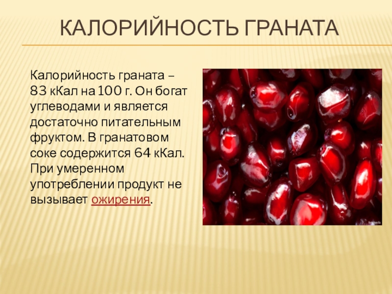 углеводами и является достаточно питательным фруктом. В гранатовом соке содержится 64 кКал. При умеренном употреблении продукт не вызывает ожирения.