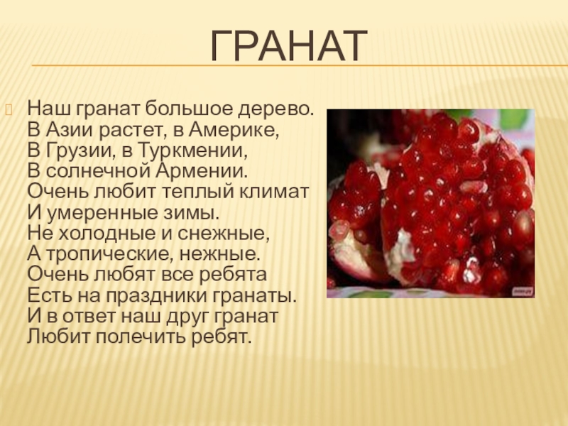 Гранаты хорошо утоляют жажду, возбуждают аппетит. Дети часто употребляющие гранаты отличаются сообразительностью, и полнотою сил.