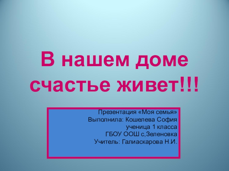 В нашем доме счастье живет!!!Презентация «Моя семья»Выполнила: Кошелева Софияученица 1 класса ГБОУ ООШ с,ЗеленовкаУчитель: Галиаскарова Н.И.