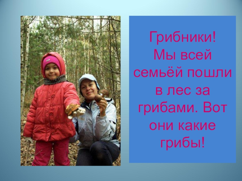 Слайд 9Грибники! Мы всей семьёй пошли в лес за грибами. Вот они какие