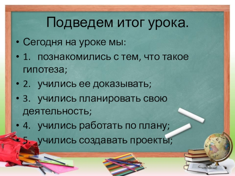 Подведем итог урока. Сегодня на уроке мы:1.	познакомились с тем, что такое гипотеза;2.	учились ее доказывать; 3.	учились планировать свою