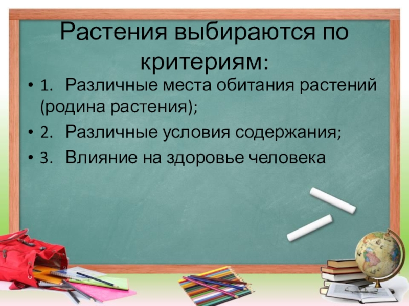 Растения выбираются по критериям:  1.	Различные места обитания растений (родина растения);2.	Различные условия содержания;3.	Влияние на здоровье человека